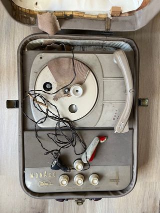 Giradischi portatile in formato valigia, modello Monaco Stereo, con meccanismo e braccio del marchio Dual. Degli anni '50-'60. Ha selettore di velocità (78 / 45 / 33 / 16 rpm). NON funziona. Ben conservato ma invecchiato e deteriorato dal tempo, con coperture rotte, cavi invecchiati e parti da sostituire. Ideale per restauro, ricambi o decorazione vintage. Venduto come visto. Visionabile senza impegno.