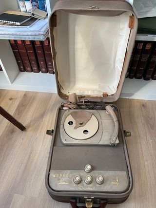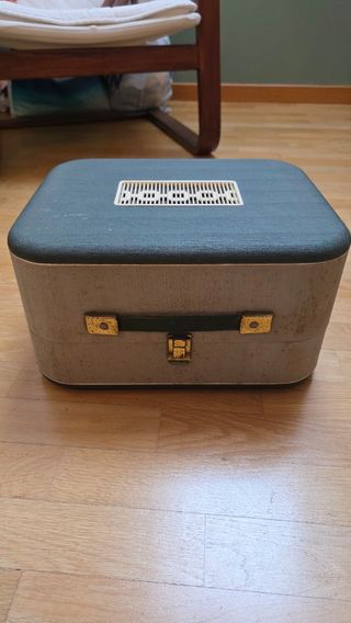Giradischi portatile da viaggio della marca General Eléctrica Española. Una collezione vintage, ideale per la decorazione o per rivivere il suono dei dischi in vinile. Questo modello risale all'epoca in cui la General Electric operava in Spagna. Stato: aspetto vintage conservato. Caratteristiche: design da viaggio con altoparlante integrato nel coperchio. Controlli di tono e volume. Portatile e facile da trasportare. Ideale per collezionisti, amanti del suono retrò e decorazione vintage. Dà un tocco unico a qualsiasi angolo. Un gioiello con storia per riprodurre i tuoi vinili!