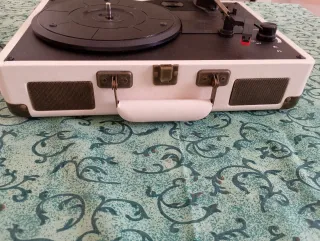 Giradischi portatile con design da valigia, ideale per portare la tua musica ovunque. - Altoparlanti integrati. - Controlli di volume e tono. - Maniglia per il trasporto. - Non l'ho mai usato. È per la decorazione a meno che tu non voglia provarci 😉