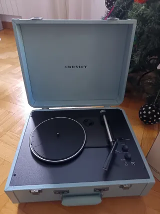Giradischi portatile Crosley Portfolio in stile valigetta. Perfetto per gli amanti della musica. - Design a 3 velocità. - Funzionalità Bluetooth integrata. - Colore azzurro/grigio. Valore euro 189,00 Praticamente come nuovo