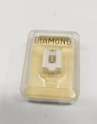 Puntina di ricambio per giradischi, presentata nella sua confezione originale. - Design con finitura DIAMOND. - Custodia protettiva trasparente inclusa.