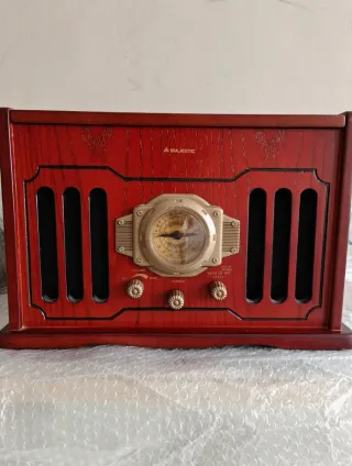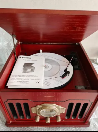 Giradischi MAJESTIC TT 35 CD Mp3 e giradischi con finitura in legno. In ottimo stato e senza segni - Design classico con dettagli dorati. - Include manuale di istruzioni. - Radio Am/Fm - Giradischi a 3 velocità - Lettore CD e cassette. No garanzia. No restituzione. Assicuro imballo adeguato, ma non mi assumo responsabilità su eventuali problemi creati dal trasporto.