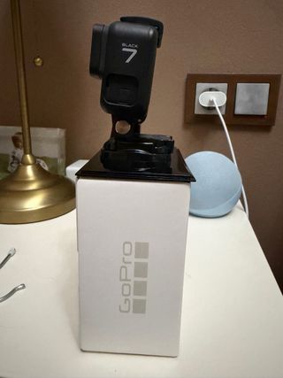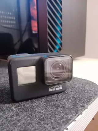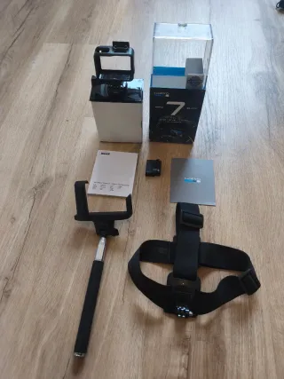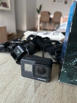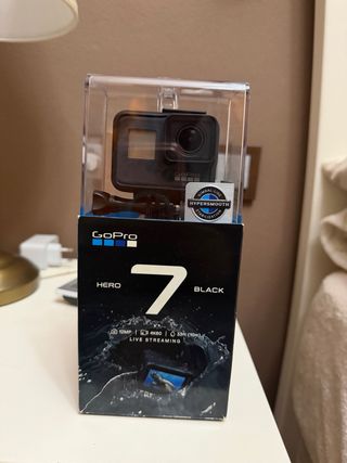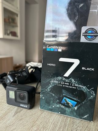 Fotocamera d'azione GoPro Hero 7 Black. Nella sua confezione. Funziona perfettamente. Include: - Accessori originali: custodia nera, batteria originale, cavo di ricarica originale, scatola, x2 supporti adesivi, supporto di sicurezza click e vite di fissaggio. - Accessori compatibili: custodia completamente chiusa, protezioni per schermo e lente, pelli di camoscio antiappannamento, tre batterie e piattaforma di ricarica. Ho altri accessori che potrebbero essere negoziati: schede SD, più supporti adesivi e viti di fissaggio, custodie per il trasporto, obiettivo fisheye/dome per l'acqua, banana galleggiante, selfie stick, imbracatura...