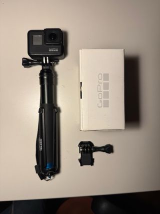 In vendita fotocamera GoPro Hero 7 Black con accessori. Include: scatola originale, supporto estensibile tipo treppiede/bastone selfie, accessorio di montaggio, colore nero, SSD 32 GB Sandisk.