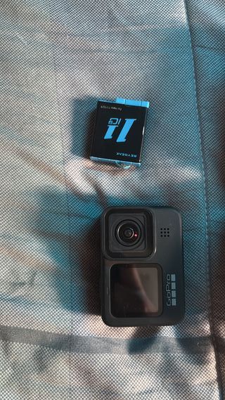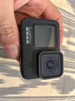 Fotocamera GoPro modello 9 in colore nero. L'ho tirata fuori dal cassetto e non si accende. La batteria è ok poiché l'ho provata su un'altra fotocamera che ho. Si vende senza batteria. Probabilmente è facile da riparare o per pezzi. - Schermo frontale. - Lente della fotocamera. - Griglia dell'altoparlante.