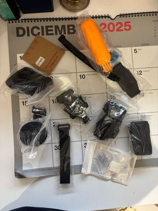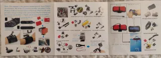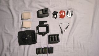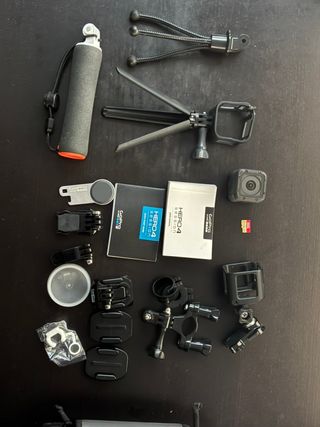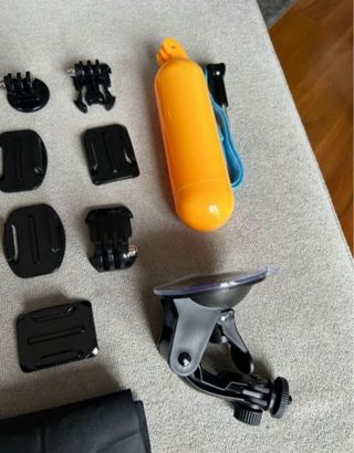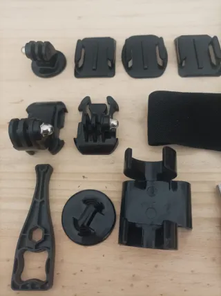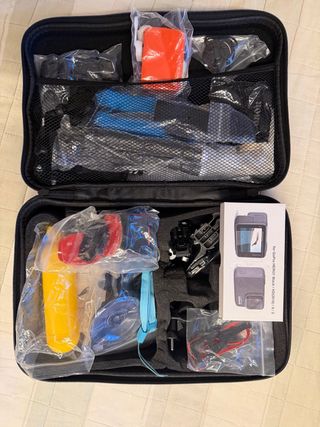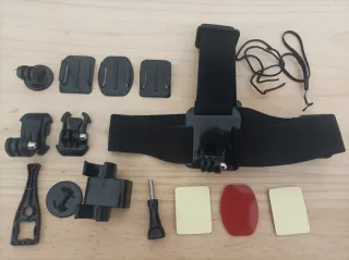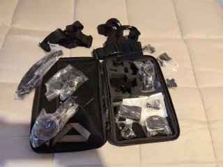 Set di accessori compatibili con fotocamere sportive tipo GoPro. Espandi le possibilità del tuo equipaggiamento. Include valigetta in perfette condizioni (cerniere incluse). Supporto per casco, fionda per petto, impugnatura galleggiante, cinturino da polso, ventosa, fionda per cani, treppiede, bastone per selfie e molto altro (chiedere o richiedere foto).