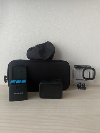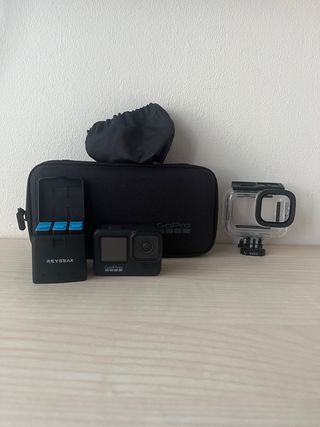 Fotocamera d'azione GoPro Hero 9 Black in colore nero, insieme a vari accessori per il suo utilizzo. - Custodia da trasporto. - Custodia protettiva. - Caricabatterie REYDEAK con 3 batterie.