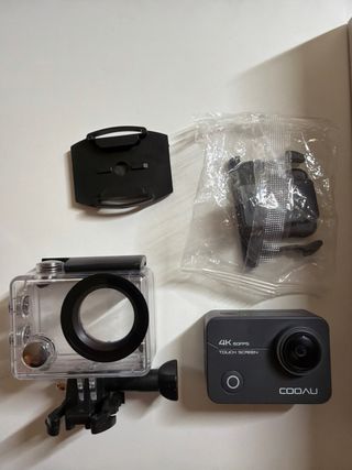 Fotocamera d'azione COOAU in grigio e nero, con schermo touch. Include vari accessori per il montaggio e l'uso. Supporta la registrazione in 4K a 60 FPS. Compatibile con GoPro, fotocamera d'azione.