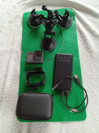 In vendita fotocamera GoPro Hero 7 Black con vari accessori. Include: custodia di montaggio, supporto con ventosa, impugnatura galleggiante arancione, cavo di ricarica. La fotocamera presenta usura esterna dovuta all'uso, ma funziona perfettamente. Non include batteria. Viene fornita con una scheda di memoria SD da 64 GB inclusa.