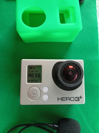Fotocamera d'azione GoPro HERO3+ in colore argento. Compatta e pronta per catturare le tue avventure. - Modello HERO3+. - Schermo frontale. - Pulsante di modalità. Non ha il cavo di ricarica, quindi non so se si accende. La vendo con tutti gli accessori mostrati in foto.