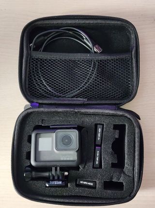 Fotocamera d'azione GoPro Hero 6 Black in colore nero. Include accessori per l'uso. - Con protettore per lente e schermo. - Custodia protettiva con scomparti. - Cavo di ricarica e trasmissione dati USB. - Filtri ND (ND8, ND16, ND32). - Supporto per fotocamera. - Batteria testata, durata: 49 minuti a 4k 4:3 a 30 fps. (Non include scheda microSD)