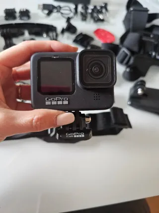 Fotocamera d'azione GoPro Hero 9 Black con vari accessori per catturare le tue avventure. - Include custodia di trasporto. - Supporto per il petto. - Supporto per il polso. - Vari supporti e adattatori. - Adesivi di montaggio. - Usata solo 3 volte, ancora con plastici sulle schermate. - Piccolo graffio sul proteggi-lente. - Il coperchio laterale era già rotto. **Non include scheda di memoria**