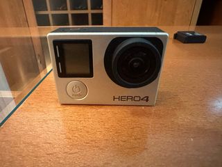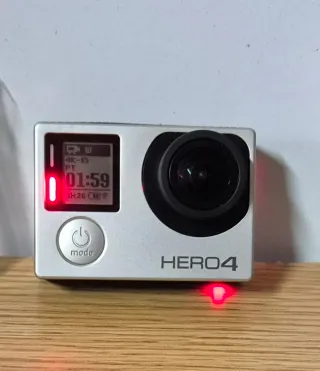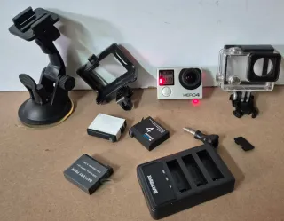 Fotocamera d'azione GoPro Hero 4 in colore argento e nero. Include accessori e custodia. - Fotocamera GoPro Hero 4. - Custodia di trasporto. - Cavo USB. - Batteria aggiuntiva. - Supporto e altri accessori. NON TRATTABILE!