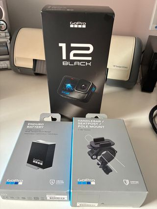 Vendo GoPro 12 Black nuova, insieme ad accessori: Supporto per bicicletta o moto, batteria aggiuntiva. Me l'hanno regalato in pensione e non l'ho mai usato. È in perfetto stato. Tutto con le sue scatole originali. - GoPro 12 Black - Batteria Enduro - Supporto per manubrio/sedile/palo