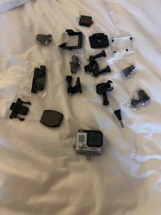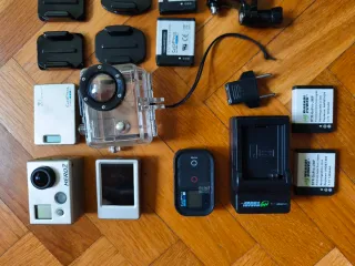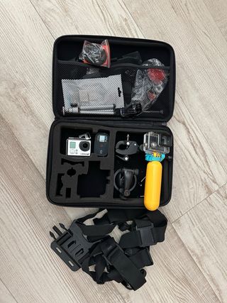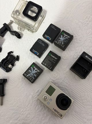 Fotocamera GoPro Hero 3 con numerosi accessori per le tue avventure. - Custodia subacquea. - Batterie aggiuntive. - Caricabatterie USB. - Supporto per il petto. - Supporto per la testa. - Varietà di supporti e adattatori. - Galleggiante giallo.