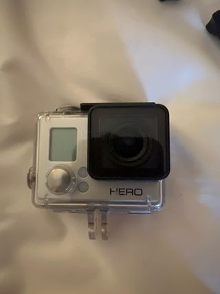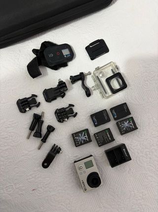 Vendo fotocamera GoPro Hero 2 con vari accessori. Include schermo, telecomando Bluetooth, diverse batterie e la sua custodia di ricarica, molti supporti e custodie di ricambio. In regalo la borsa per riporre tutto. La vernice della fotocamera è un po' appiccicosa per essere stata conservata per molti anni. - Fotocamera GoPro Hero 2. - Custodia impermeabile. - Schermo posteriore. - Batterie. - Caricabatterie. - Supporti e adattatori. - Manuali e porte della custodia.