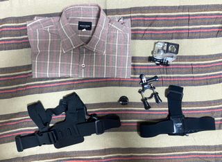 Kit di accessori per fotocamera GoPro e camicia Dockers per Max. Include: - Carcasa GoPro compatibile con GoPro 3 e 4 - Imbracatura GoPro per la testa - Imbracatura generica per il petto - Supporto per manubrio di bicicletta o moto per GoPro - Adattatore di montaggio 1/4" per GoPro - Camicia Dockers taglia M