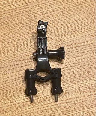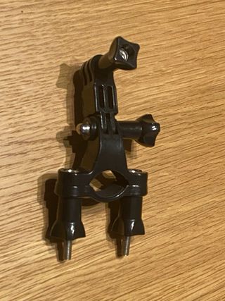 Accessorio di montaggio per fotocamere GoPro, progettato per biciclette e motociclette. Realizzato in plastica nera. Include viti per l'installazione.