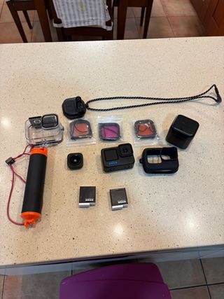 Fotocamera d'azione GoPro Hero 10 in ottime condizioni. Utilizzata pochissime volte. Modello Hero 10, colore nero. Batteria, 2 micro SD e altri accessori inclusi. Attenzione: il caricatore è perso, quindi non incluso. Tuttavia, per la ricarica è USB tipo C, quindi non c'è problema nell'usare qualsiasi altro tipo di cavo.