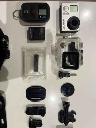 Fotocamera d'azione GoPro Hero 3+ in colore argento. Include vari accessori per l'uso. -3 batterie -Caricabatterie -Imbracatura per il petto -Custodia impermeabile -Manico galleggiante -Vari supporti e fissaggi -Protezione e custodia per lenti