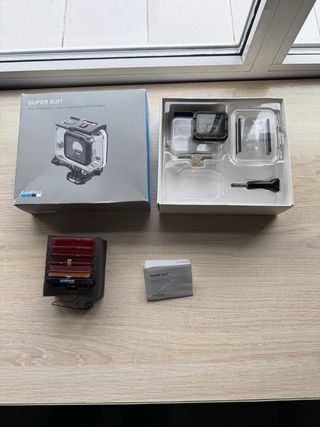 Carcassa subacquea Super Suit per GoPro Hero 5 Black. Protegge la fotocamera ed è valida per l'immersione. Protezione contro acqua e urti. Include i filtri per subacquei per garantire un buon colore dell'immagine sott'acqua. Usato ma in ottime condizioni.