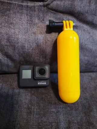 Fotocamera GoPro Hero 7 Black con manico galleggiante giallo. 🟢Una fotocamera con un'ottima qualità in grado di registrare in 8k. Presenta piccoli graffi. Probabilmente non funziona a causa della batteria, che si è bagnata e da allora non ha più funzionato. Collegandola e rimuovendo la batteria, sono riuscito ad accenderla, ma non altro.