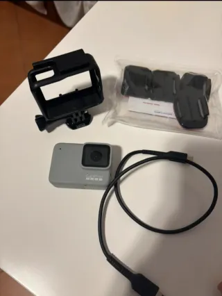 Fotocamera d'azione GoPro Hero7. - Design compatto e resistente. - Obiettivo grandangolare. - Logo GoPro visibile sul corpo macchina.La fotocamera che ovviamente ha qualche hanno non è mai stata usata causa disinteresse. Il prezzo comprende anche la pettorina di supporto.
