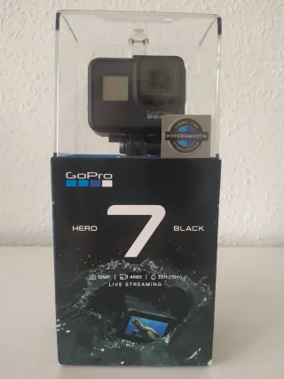 Fotocamera d'azione GoPro Hero 7 Black. Nella sua confezione. Funziona perfettamente. Include: - Accessori originali: custodia nera, batteria originale, cavo di ricarica originale, scatola, x2 supporti adesivi, supporto di sicurezza click e vite di fissaggio. - Accessori compatibili: custodia completamente chiusa, protezioni per schermo e lente, pelli di camoscio antiappannamento, tre batterie e piattaforma di ricarica. Ho altri accessori che potrebbero essere negoziati: schede SD, più supporti adesivi e viti di fissaggio, custodie per il trasporto, obiettivo fisheye/dome per l'acqua, banana galleggiante, selfie stick, imbracatura...