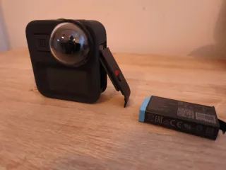 Fotocamera d'azione GoPro Max 360, ideale per catturare momenti immersivi. Include custodia protettiva, 1 batteria e coperchio della batteria con apertura per registrare e caricare contemporaneamente.