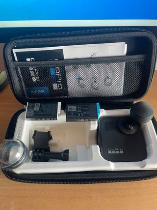 Fotocamera per azione e sport a 360 gradi. Include: Custodia con la fotocamera, 2 batterie... Borsa con 3 accessori. Custodia con una grande varietà di accessori. Modello GoPro MAX. Colore nero. Funziona perfettamente, quasi senza utilizzo. Tre fotocamere in una. Goditi una totale libertà creativa con la fotocamera a 360° più versatile. Con GoPro MAX avrai tre fotocamere in una: incredibile contenuto sferico, video e foto in stile HERO e funzioni per vlog senza pari. Le funzioni a 360° offrono stupende foto panoramiche, oltre a sequenze a 360°. Con una stabilizzazione incomparabile, un audio avanzato a 6 microfoni e un design