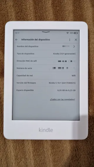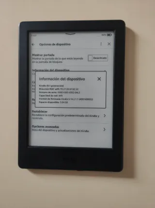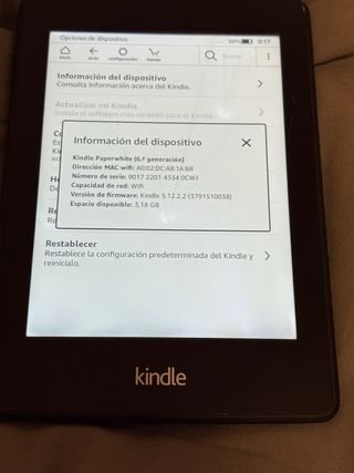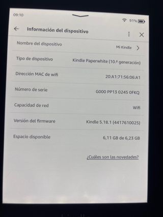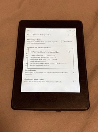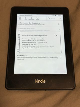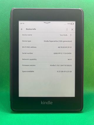 E-reader Kindle Paperwhite di 10ª generazione in colore nero. Goditi le tue letture preferite con questo dispositivo. - Modello: Kindle Paperwhite (10ª generazione) - Indirizzo MAC del Wi-Fi: 20:A1:71:56:06:A1 - Numero di serie: G000 PP13 0245 OFKQ - Versione del firmware: Kindle 5.18.1 (4417610025) - Spazio disponibile: 6,11 GB su 6,23 GB