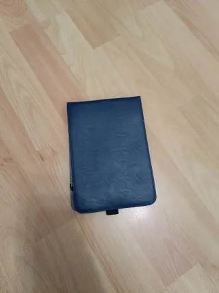 Custodia protettiva per Kindle da 6 e 7 pollici. Il suo design è elegante e funzionale poiché permette di fissarlo con una cinghia da polso. Colore blu. Materiale tipo pelle. Le punte posteriori sono leggermente usurate.