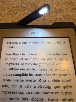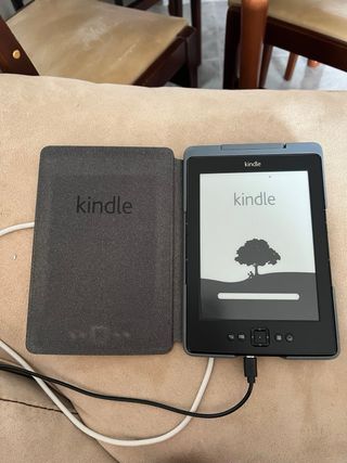 Lettore di libri elettronici Kindle di 4ª generazione, colore nero. Include custodia originale Kindle con luce integrata. - Schermo a inchiostro elettronico. - Design compatto e leggero. - Questo modello di Kindle non aveva la luce, quindi ho acquistato la custodia. IMPORTANTE: Lo schermo ha un piccolo urto, motivo per cui si vede il punto nero nella parte superiore centrale (vedi prima foto) Si vende perché mi è stato regalato un altro.