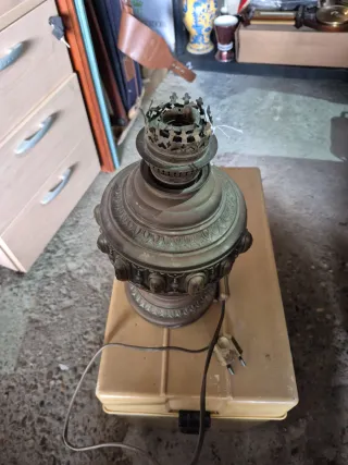 Lampada in stile antico con dettagli ornamentali. Realizzata in ottone con finiture dorate e marroni. Base e corpo con motivi decorativi. Include cavo di alimentazione. Misure: 32 cm di altezza x 15 cm di base.