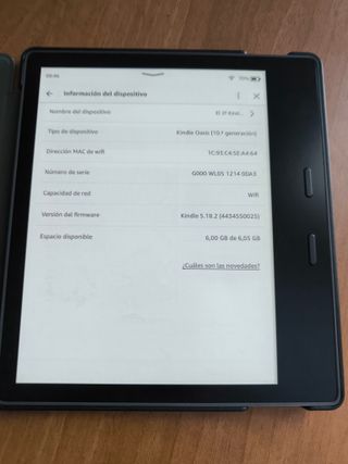 Kindle Oasis di 10ª generazione in colore nero, con custodia protettiva. Modello: Kindle Oasis (10ª generazione). Versione firmware: Kindle 5.18.2. Spazio disponibile: 6,00 GB su 6,05 GB.