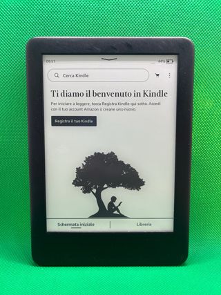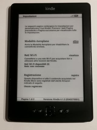 Kindle di 5^ generazione perfettamente funzionante e in buone condizioni estetiche. Versione senza pubblicità da 2GB, ha il Wi-Fi ma non ha la retroilluminazione. Ha un piccolo difetto sullo schermo (visibile in foto) ma non disturba la lettura. Adatto a chi vuole un Kindle senza spendere molto. È possibile trasferire i propri eBook tramite il computer 💻 Sul mio profilo trovi altri prodotti simili ✅ - Schermo da 6 pollici. - Connessione Wi-Fi. - Manuale utente Kindle incluso.