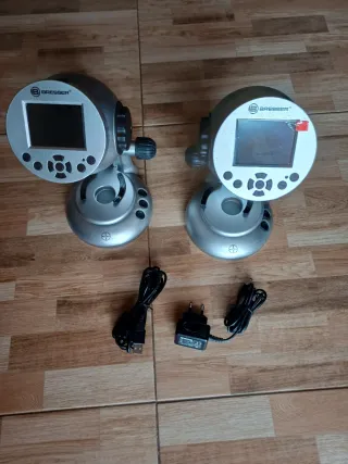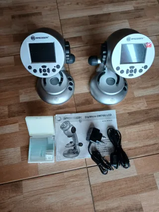 In vendita due microscopi Bresser in colore argento. Includono i rispettivi cavi e adattatori di corrente. - Due unità incluse. - Design moderno e compatto.