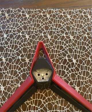 Supporto per monitor dal design moderno, con finiture rosse e nere. - Base a forma di V. - Parte centrale in plastica nera. - Finiture rosse lucide.