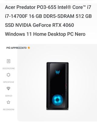 Vendo PC gaming Acer Predator PO3-655, perfetto per giocare ai titoli più recenti. - Processore Intel Core i7-14700F - 16 GB di RAM DDR5-SDRAM - SSD da 512 GB - Scheda grafica NVIDIA GeForce RTX 4060 - Sistema operativo Windows 11 Home - Colore Nero