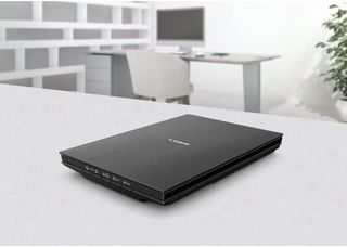 Scanner piatto del marchio Canon, modello CanoScan LIDE 100. Design elegante e compatto. Tecnologia di illuminazione LED.