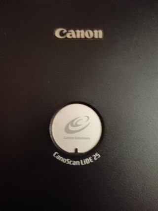 Scanner piatto da tavolo in colore nero. Modello: CanoScan LiDE 25. Marca: Canon. Include adesivo decorativo.