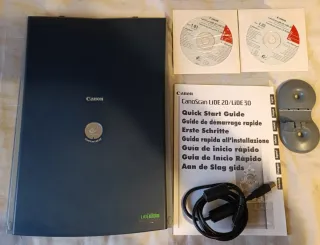 Scanner piatto Canon, modello CanoScan LiDE20 con connessione USB. Include CD di installazione