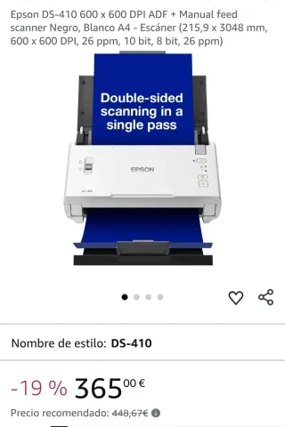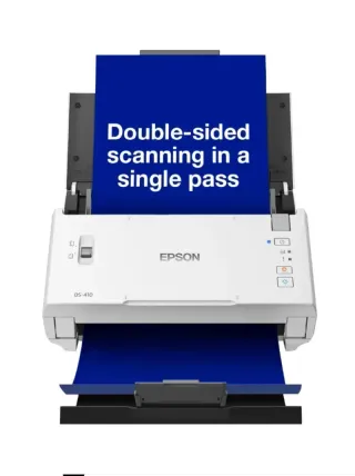 Scanner professionale per documenti Epson WorkForce DS-410 con alimentazione automatica da 50 fogli e scansione duplex in un unico passaggio fino a 52 ipm (26 ppm) per documenti A4. Risoluzione ottica di 600 × 600 dpi e uscita fino a 1200 × 1200 dpi, profondità di colore di 48 bit in ingresso e 24 bit in uscita. Supporta formati fino a 215,9 × 3.048 mm, grammature da 50-209 g/m² e include rilevamento doppia alimentazione e tecnologia Paper Protection per evitare errori. Interfacce USB 2.0, compatibili con TWAIN/ISIS, ciclo giornaliero fino a 3.000 pagine, dimensioni 297 × 152 × 154 mm e peso 2,5 kg. Ideale per ufficio, digitalizzazione...
