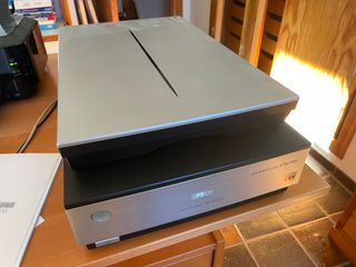 Scanner piatto Epson Perfection 2480 Photo. Progettato per digitalizzare fotografie. Finitura in grigio e argento.
