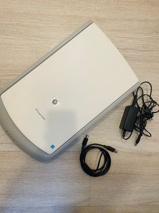 Scanner piatto HP Scanjet G2410 in bianco e grigio. Include adattatore di alimentazione e cavo USB. Design compatto ed elegante. Ideale per digitalizzare documenti e foto. Spedizione con InPost o Seur.