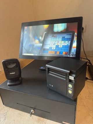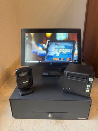 Sistema TPV touch completo, ideale per attività commerciali. - Schermo touch HP. - Cassetto portamonete. - Scanner di codici a barre. - Stampante per scontrini.