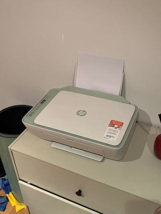 Stampante HP Deskjet 4230e in bianco e blu. Design moderno e compatto. Vassoio di uscita carta. Scanner integrato nella parte superiore. Ottima qualità di stampa. Cartuccia nera originale HP integrata. Servizio HP Ink eccezionale. La stampante funziona benissimo ma non ci serve più perché siamo tornati in ufficio e non la usiamo.