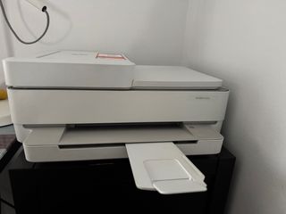 Stampante multifunzione HP Envy 6032 in bianco e grigio con funzione di scanner. Include tutti i cavi e tutto il necessario.