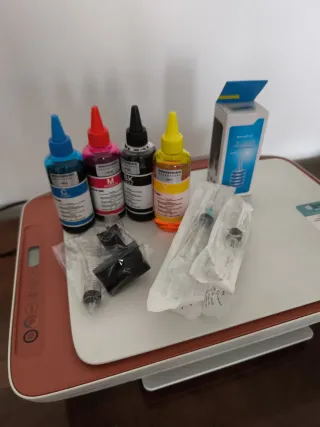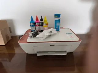 Stampante multifunzione HP DeskJet 2723. - Colore: bianco e rosa. - Include inchiostri e siringhe per la ricarica. - Scanner A4 - Senza le cartucce originali