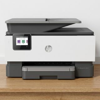Stampante multifunzione HP OfficeJet Pro 8022 a colori in grigio e bianco. Progettata per l'ufficio o la casa. Praticamente nuova, non utilizzata. Scanner integrato, schermo touch per il controllo, vassoio carta, connessione per cavo alimentazione.